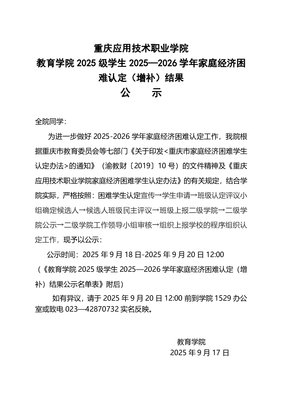 教育学院 2025 级学生 2025—2026 学年家庭经济困 难认定(增补)结果公示